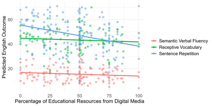 This study investigates how the quantity and quality of digital media use influence the language outcomes of bilingual children in Singapore. The sample includes 140 children aged 4 years 4 months to 7 years 3 months. Mobile screen use was measured with the QQ-MediaSEED, while standardized assessments such as the BLAB captured language proficiency. Preliminary analyses reveal several key patterns. Children spend more screen time in English than in their Mother Tongue, but the quality of screen use significantly predicts proficiency in both languages. Parental mediation also plays an important role: children who co-use screens with parents show stronger English receptive vocabulary, while those whose parents provide supervision during screen time perform better in Mother Tongue receptive vocabulary. These findings highlight the complex role of digital media in bilingual development and the importance of educational content and parental involvement.